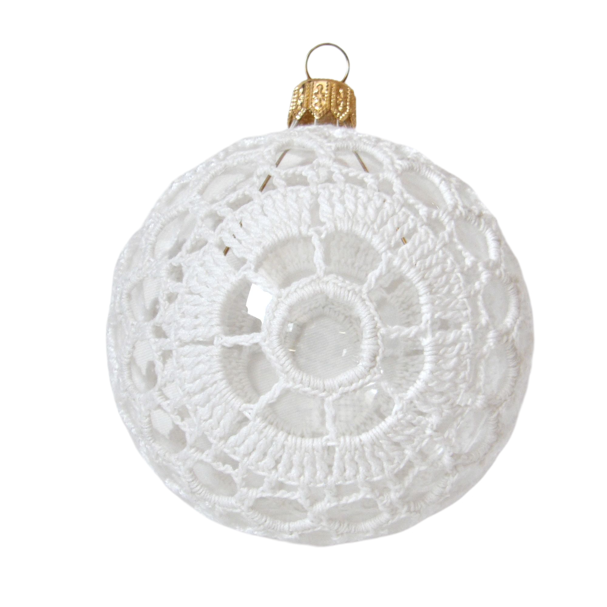 Glob de Craciun imbracata in dantela alba realizata manual cu model circular un element decorativ elegant si delicat, acest glob de sticla cu diametrul de 10 cm imbracat in dantela alba din bumbac crosetata manual cu model circular adauga un farmec vintage si sofisticat oricarei incaperi.